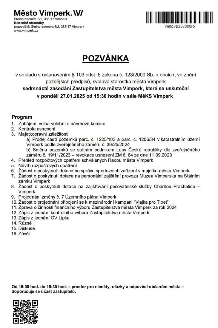 Zasedání se koná v pondělí 27. ledna od 15,30 hodin v sále Městského kulturního střediska Vimperk.