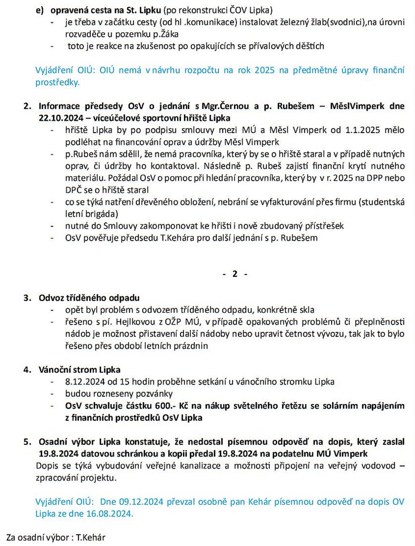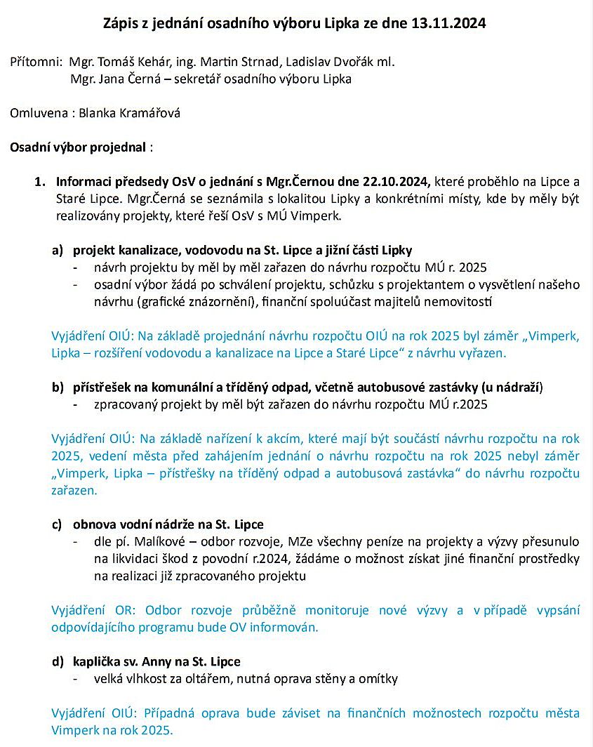 Zápis je součástí programu zasedání zastupitelů města v pondělí 27. ledna. Při současném složení radniční koalice nelze předpokládat, že by se na stanovisku odborů městského úřadu něco změnilo. Uvidíme, zda alespoň u opozice najdou občané Lipky slovní zastání.