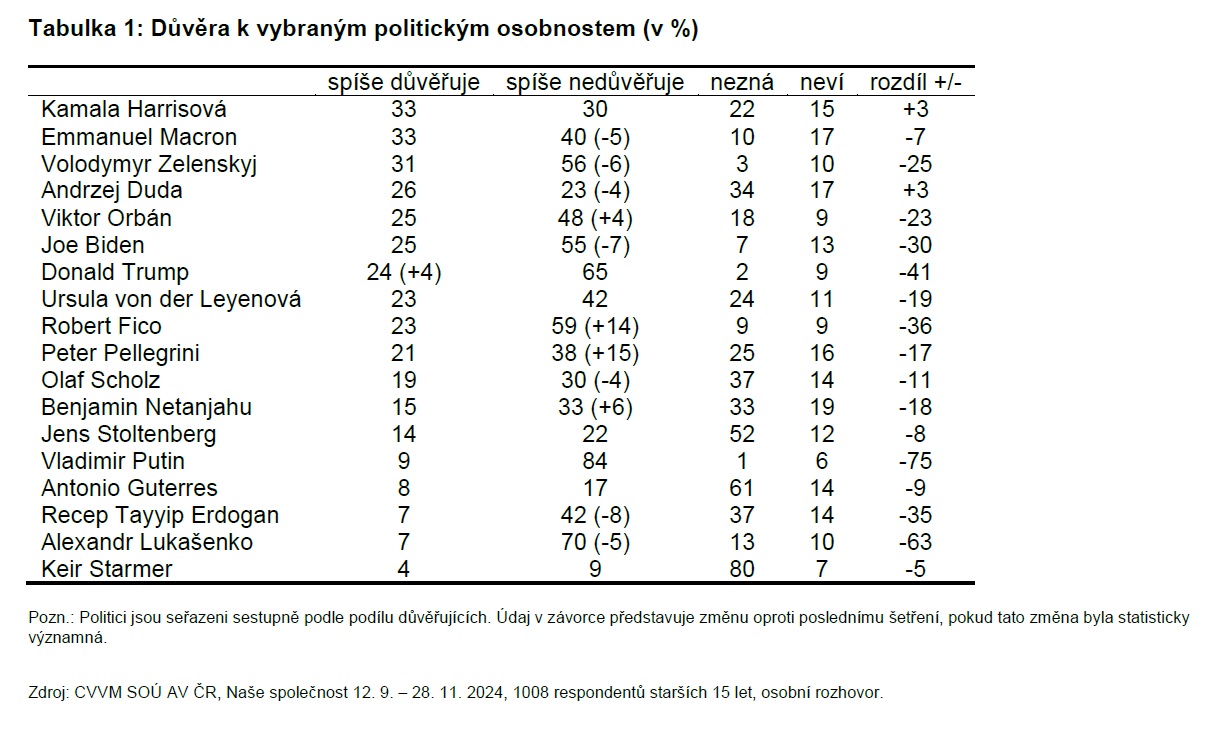 V šetření, které se v období od poloviny září do konce listopadu 2024 uskutečnilo v rámci kontinuálního výzkumu veřejného mínění CVVM, byla respondentům položena otázka zjišťující důvěru k vybraným politikům v mezinárodním kontextu. Do výzkumu byly zahrnuty jak významné osobnosti světové politiky a aktéři významných událostí z poslední doby, tak někteří nejvyšší ústavní činitelé středoevropského regionu.