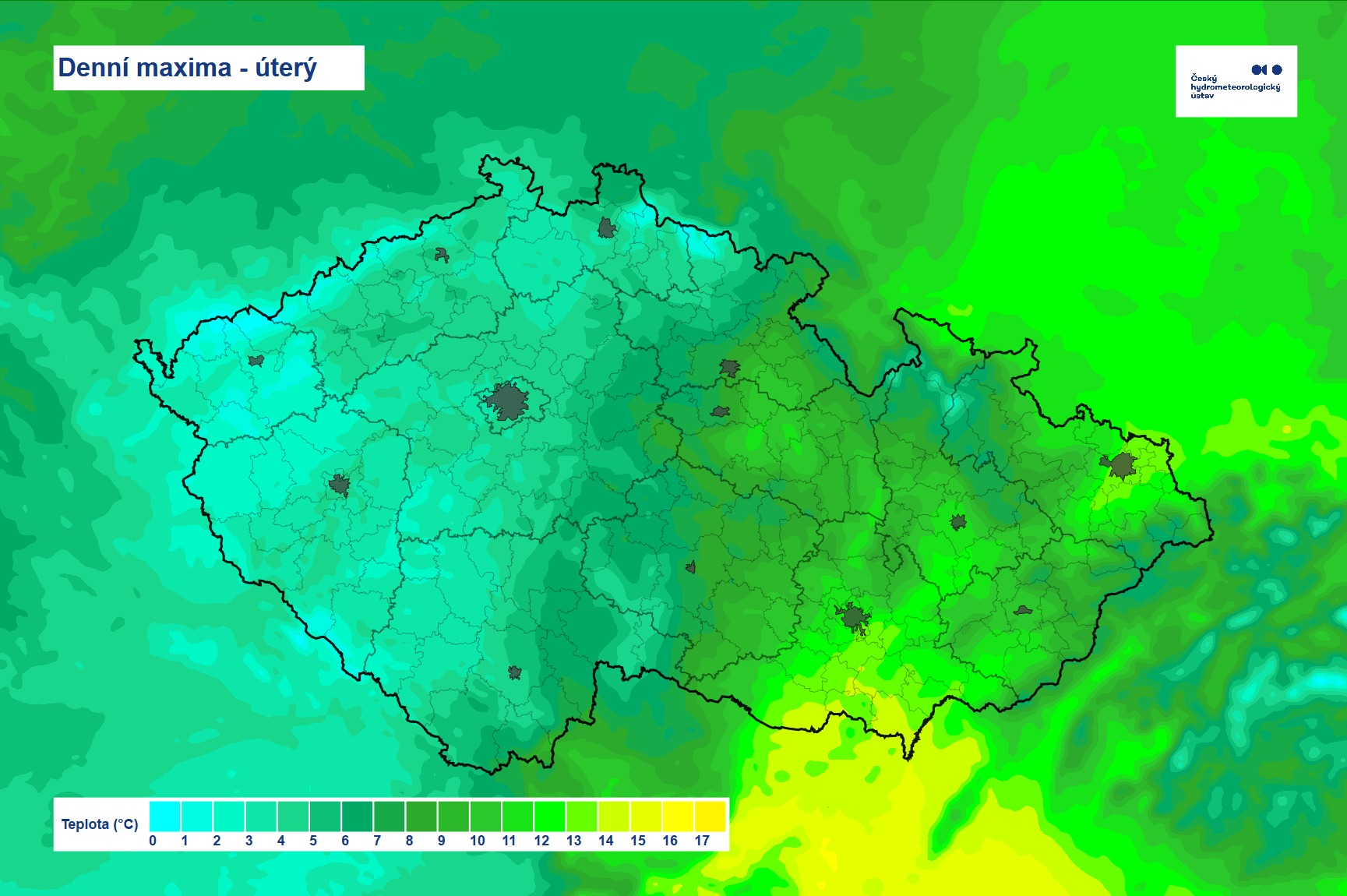 V úterý před frontou teploty vystoupí na Moravě a ve Slezsku na 8 až 12 °C., na jihu Moravy a na Ostravsku až na 14 °C.