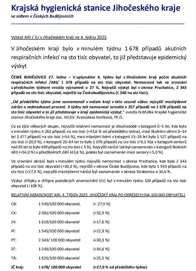 AKTUÁLNĚ: V Jihočeském kraji bylo v minulém týdnu 1 678 případů akutních respiračních infekcí na sto tisíc obyvatel, to již představuje epidemický výskyt