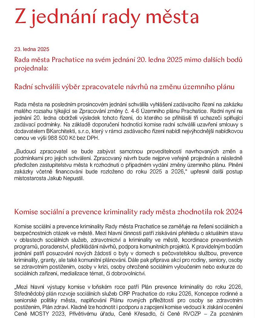 JIŽNÍ ČECHY: Co se děje v Prachaticích. Informace z jednání zastupitelů města