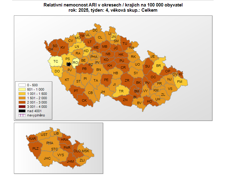 Hlášená celková nemocnost akutními respiračními infekcemi (ARI) v ČR ve 4. týdnu roku 2025 je na úrovni 1940 nemocných na 100 000 obyvatel, což představuje vzestup o téměř 30 % oproti minulému týdnu. V kategorii chřipkových onemocnění (ILI) se pak za stejné období nemocnost zvýšila o téměř 80 %. Jde o očekávaný vývoj v souladu s předchozími respiračními sezónami.