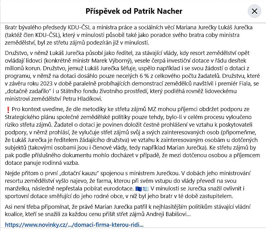 KOMENTÁŘ NA SÍTI: Jurečkovi a jejich opakovaný střet zájmů