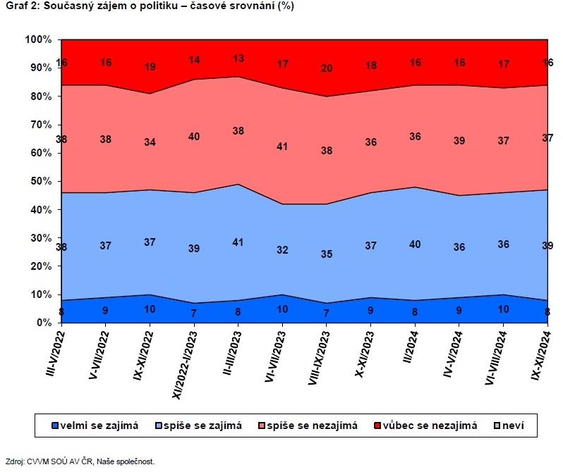 Součástí pravidelného šetření CVVM SOÚ AV ČR, které proběhlo v období od poloviny září do konce listopadu roku 2024, byly i otázky zjišťující obecný zájem o politiku a to, jak často lidé sledují celospolečenské dění prostřednictvím médií, internetu či sociálních sítí a případně o něm diskutují mimo internetové prostředí. Zájem o politiku obecně deklaruje necelá polovina (47 %) populace, přičemž méně než desetina (8 %) se o ni velmi zajímá, naopak 16 % se o politiku vůbec nezajímá.