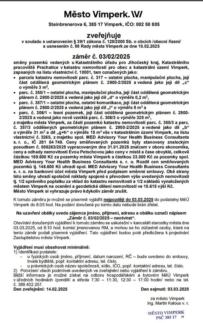 NAŠE MĚSTO VIMPERK: Úřední deska radnice – hospodaření s majetkem