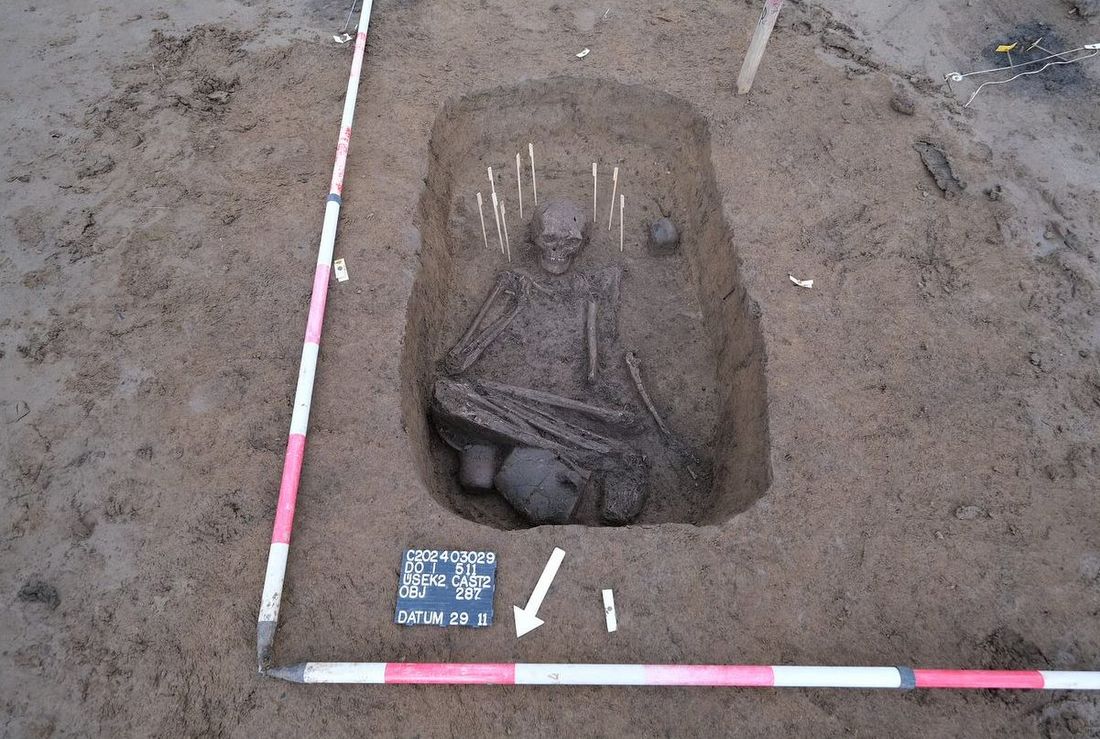 „Zajímavá byla úprava hrobu, který byl na povrchu velmi pravděpodobně označen malou mohylou a mělkým žlábkem, i samotné pohřební jámy, ve které jsme identifikovali obvodovou římsu či lavici podél delší stěny, tzv. niku, a pozůstatky dřevěné rakve. Na lavici bylo při ukládání těla položeno kopí, pravděpodobně s ratištěm, protože jeho hrot jsme nalezli zaražený do stěny pohřební jámy. V tulejce se dokonce ještě dochovaly nepatrné stopy po ratišti,“ popisuje Petra Maříková Vlčková z Archeologického ústavu AV ČR, Praha, vedoucí výzkumu tohoto úseku. V tomto jediném nevykradeném hrobě se dochovala bohatá pohřební výbava. „Můžeme zmínit například železný meč, nůž, prubířský kámen v dřevěném pouzdře, brousek, minimálně dvě velké keramické nádoby, součásti opasku či spony,“ říká vedoucí výzkumu.