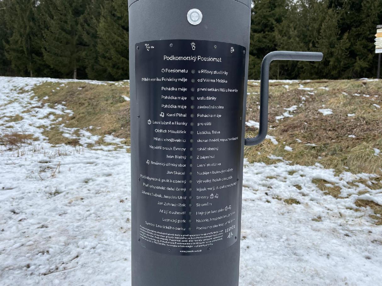 Stačí jen párkrát zatočit klikou a zvolit na poesiomatu, zařízení připomínajícím megafon nebo gramofon, jednu z dvaceti nahraných básní, písní i historek místních a regionálních autorů. Lesy České republiky ho instalovaly u Ríšovy studánky v brněnských Podkomorských lesích.