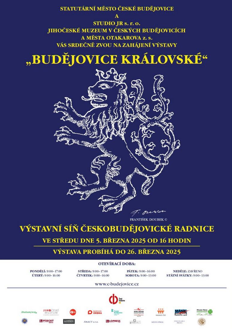 5. března 2025 v 16:00 hodin proběhne ve výstavní síni v radniční budově na náměstí Přemysla Otakara II. veřejně přístupná vernisáž výstavy „BUDĚJOVICE KRÁLOVSKÉ“. Výstava potrvá tři týdny a představí zajímavé exponáty z výtvarného umění, např. dílo píseckého autora F. Doubka z Galerie Zlatý Kříž. Součástí výstavy jsou originály medailí a vyznamenání, které byly pro Jihočeský kraj a Statutární město České Budějovice vydány Studiem JR s.r.o.. Unikátem je rovněž téměř kompletní koňský postroj krále Matyáše ze sbírek Jihočeského muzea v Českých Budějovicích. K vidění budou také repliky odznaků královské moci z hrobky Přemysla Otakara II. v katedrále sv. Víta v Praze, které zapůjčí českobudějovický spolek Města Otakarova. Vystavovatelé jsou spolu s městem České Budějovice rovněž organizátory akce „VIA BUDVICENSIS“. Jejími partnery jsou mimo jiné Jihočeský kraj, Biskupství českobudějovické, děkanství u Kostela sv. Mikuláše, Konzervatoř České Budějovice, Agentura Kultur – Kontakt i zapsaný ústav Evropské hlavní město kultury (EHMK).