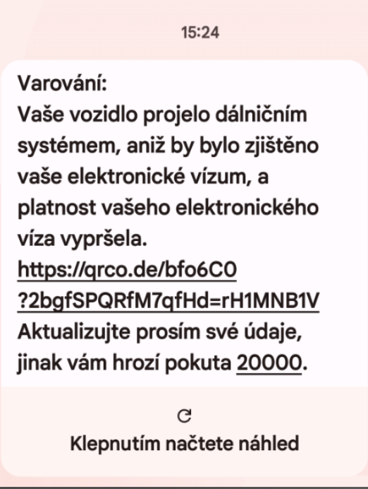 AKTUALITY: Pozor na podvodné SMS vyzývající k zaplacení pokuty za jízdu bez dálniční známky