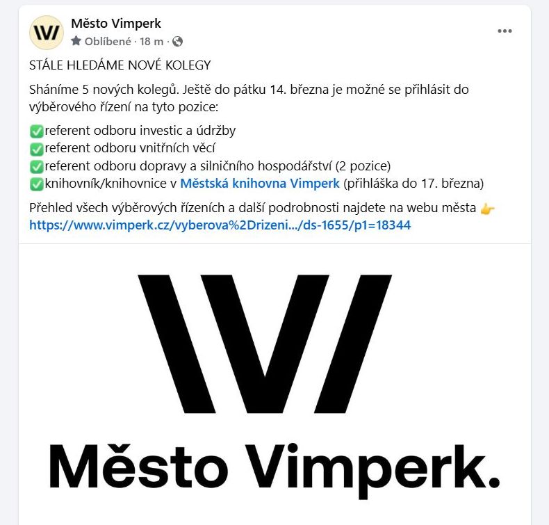 Vimperská radnice zopakovala tento týden předchozí nabídky pěti volných pracovních pozic. Sdělení je na radničním webu a na facebookovém profilu města.