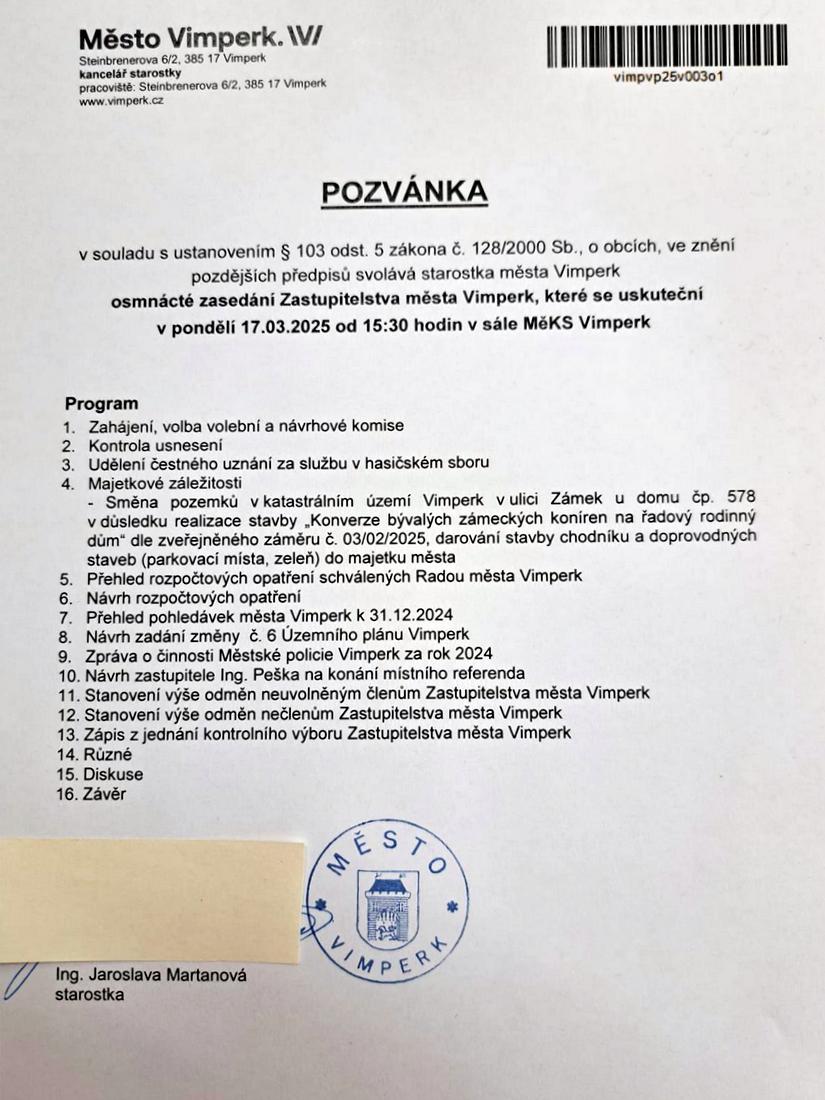 NAŠE MĚSTO VIMPERK: Pozvánka na 18. zasedání městského zastupitelstva