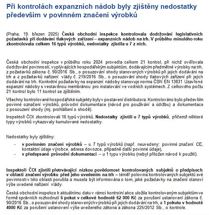 AKTUALITY: Při kontrolách expanzních nádob byly zjištěny nedostatky především v povinném značení výrobků