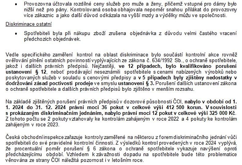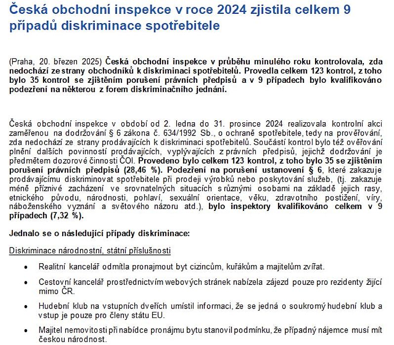 AKTUALITY: Česká obchodní inspekce v roce 2024 zjistila devět případů diskriminace spotřebitele