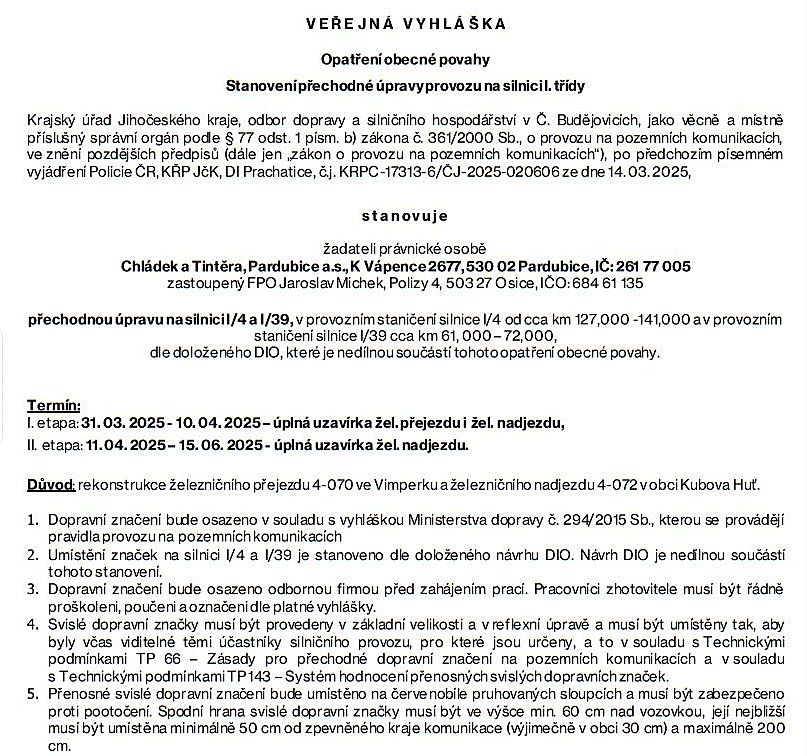 Domů JIHOČESKÝ KRAJ A ČR JIŽNÍ ČECHY: Krajský úřad stanovil veřejnou vyhláškou přechodnou úpravu provozu na silnici...