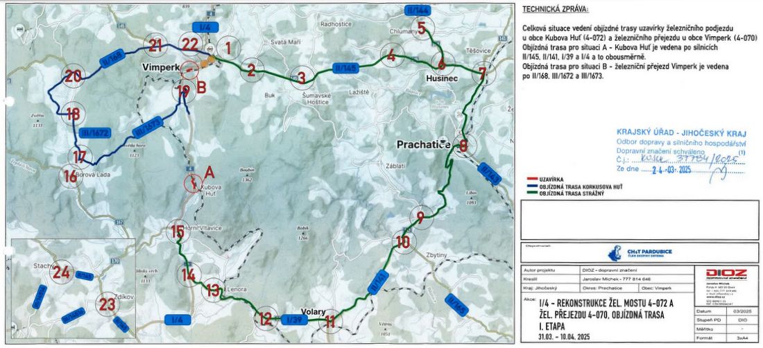 Pondělí 31. března je den, kdy může podle rozhodnutí Krajského úřadu Jihočeského kraje v Českých Budějovicích začít uzavírka silnice I/4 z Vimperka do Strážného v souvislosti s opravou železničního přejezdu ve Vimperku a železničního viaduktu u Kubovy Huti. Krajský úřad zveřejnil rozhodnutí formou veřejné vyhlášky v ponděli 24. března na úřední desce.