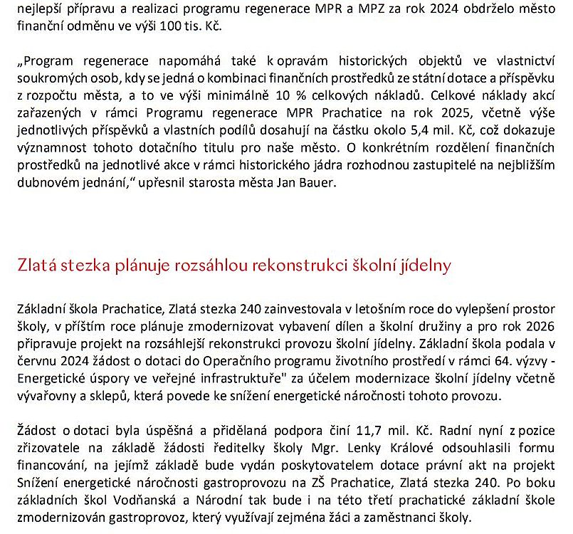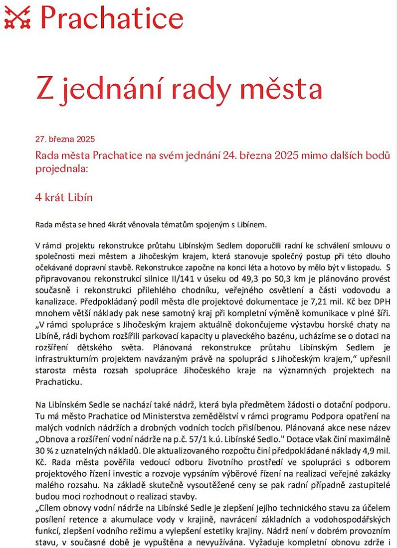JIŽNÍ ČECHY: Co se děje v Prachaticích. Informace ze schůze městských radních – 3. března 2025
