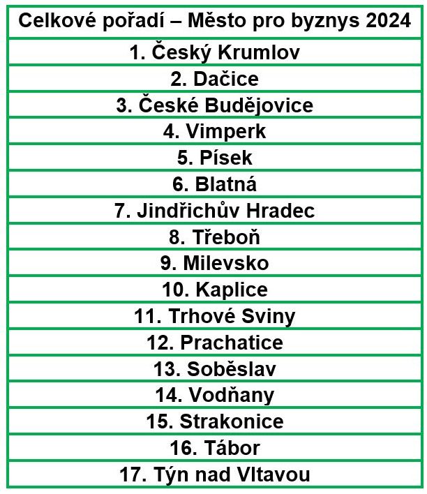 Vítězem letošního ročníku výzkumu Město pro byznys se v Jihočeském kraji stalo město Český Krumlov. Podnikatelské prostředí se rozvíjí také v Dačicích a v Českých Budějovicích. Srovnávací výzkum zpracovává již osmnáctým rokem analytická agentura Datank a hodnotí v něm všech 205 obcí s rozšířenou působností v České republice a městské části Hlavního města Prahy.