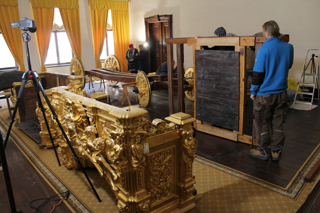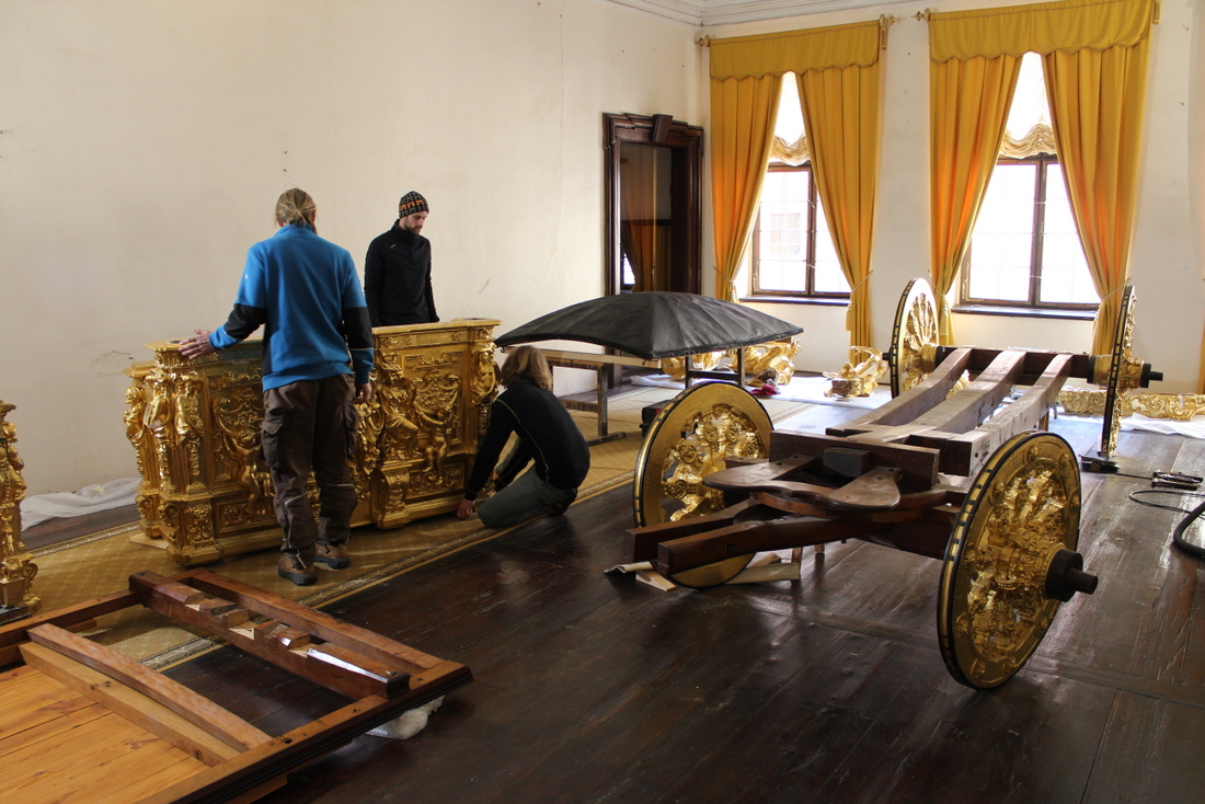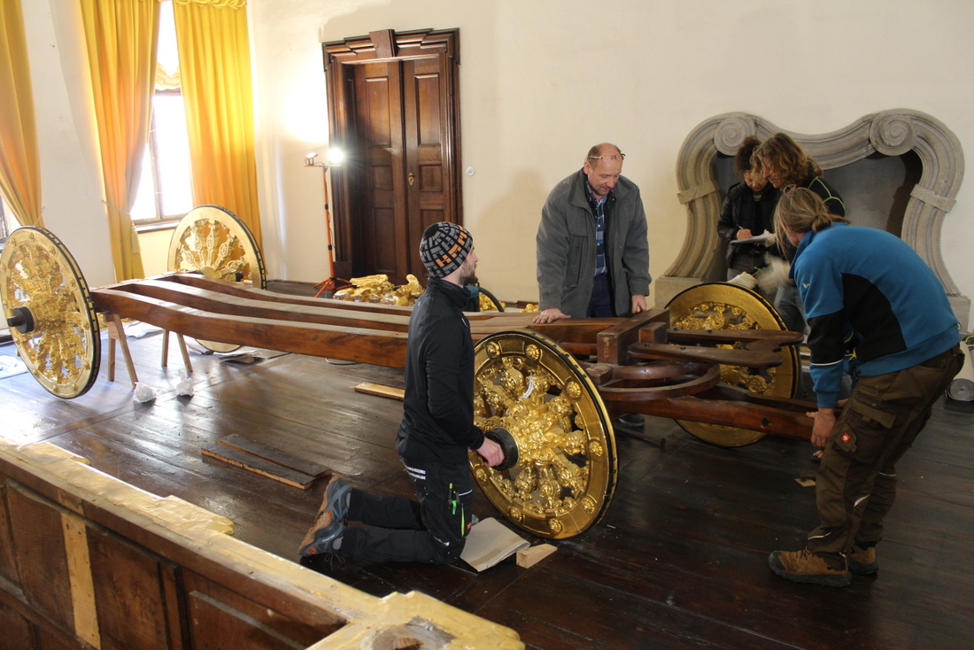 Zlatý vůz je připraven na cestu do Štýrského Hradce. Kvůli svým impozantním rozměrům (d. 560 cm, š. 200 cm, v. 300 cm) jej tým restaurátorů pečlivě rozmontoval na sedmdesát částí, které se nyní aklimatizují v temperovaných prostorách zámku, než budou zabaleny a umístěny do transportních beden. Demontáži předcházel rozsáhlý restaurátorský průzkum a konzervátorské ošetření vozu. Opraveny byly i některé doposud chybějící části podvozku a dekorativní prvky. V dubnu 2025 tým odborníků vůz sestaví až ve výstavních prostorách eggenberského zámku ve Štýrském Hradci.