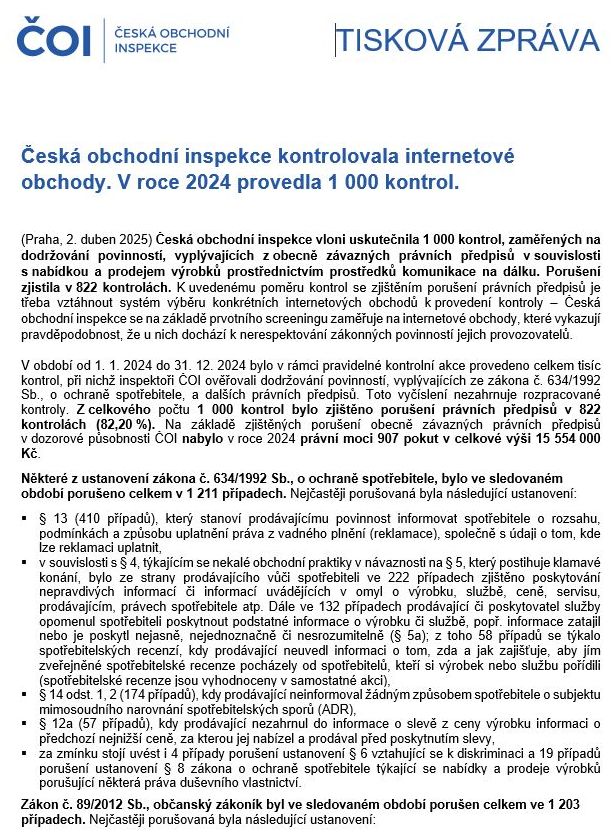 Domů AKTUALITY AKTUALITY: Česká obchodní inspekce kontrolovala internetové obchody. V roce 2024 provedla 1...