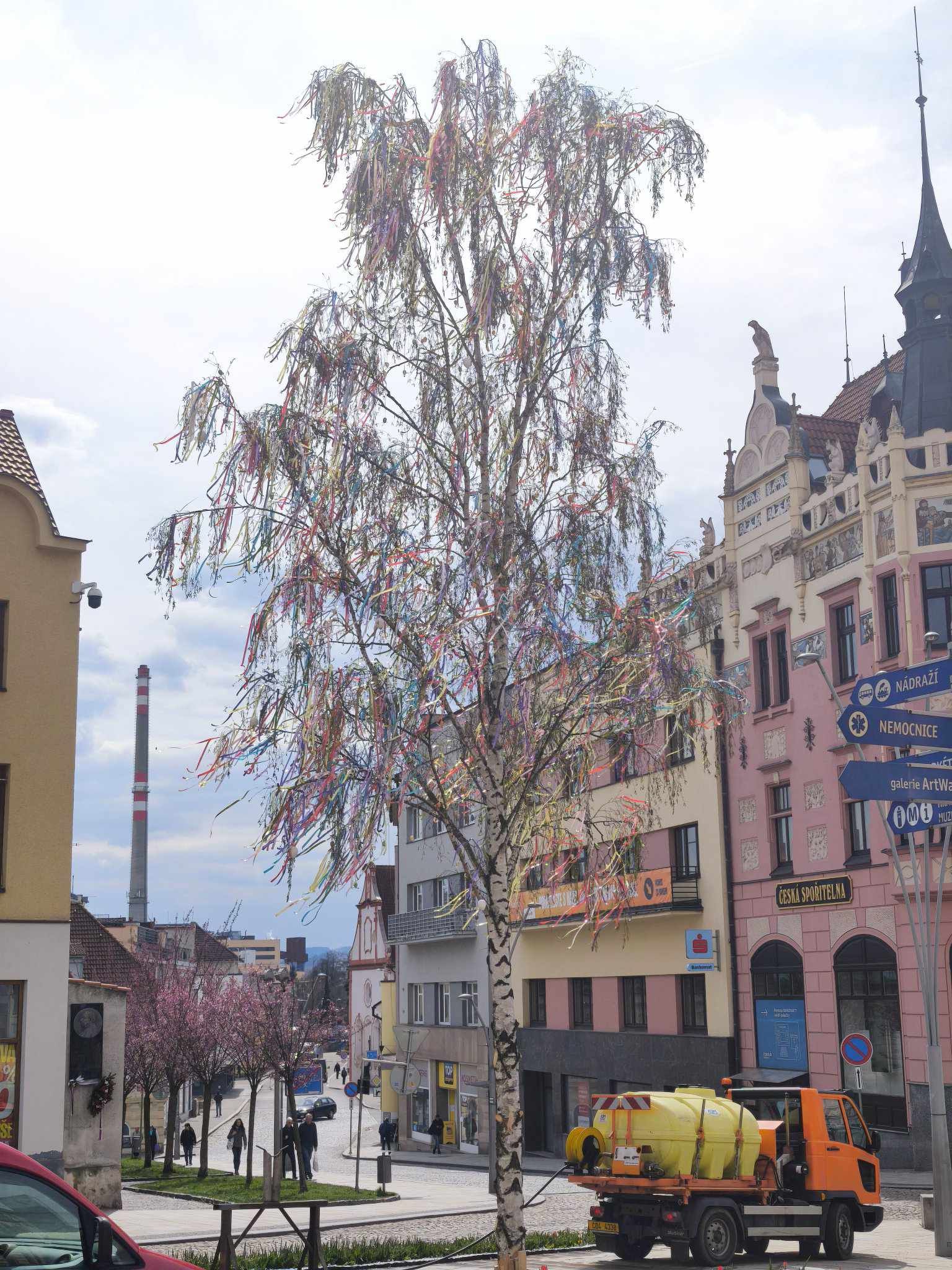 Na výzdobu břízy se použily čtyři kilometry vzdušných barevných stuh, nechybí samozřejmě ani velikonoční vajíčka. Těch jsou rovné dvě stovky. Uznejte, že dvanáct párů rukou mělo co dělat, aby už před obědem byla bříza nachystaná dělat radost kolemjdoucím. Výsledkem je jemná, ale působivá podívaná, která symbolizuje nejen přicházející svátky, ale i rozloučení se s aktuální podobou náměstí – to se totiž v blízké době začne měnit díky připravované rekonstrukci.