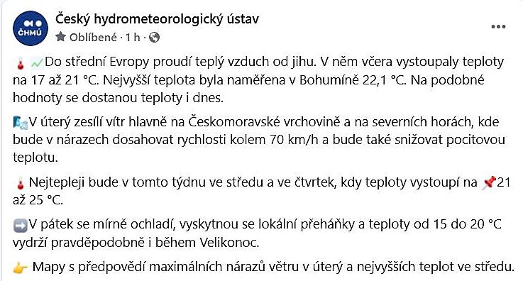 ČESKÝ HYDROMETEOROLOGICKÝ ÚSTAV: Počasí do pátku 18. dubna