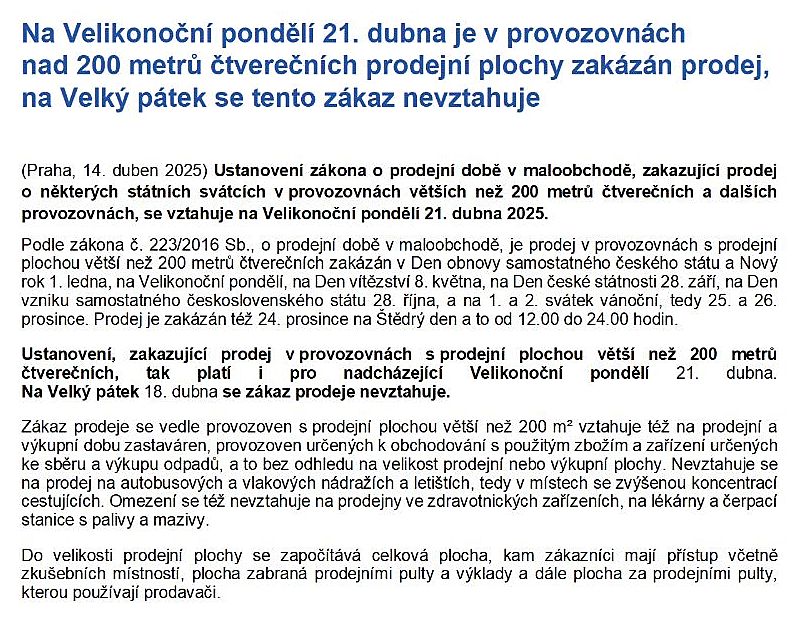 AKTUALITY: Na Velikonoční pondělí 21. dubna je v provozovnách nad 200 metrů čtverečních prodejní plochy zakázán prodej, na Velký pátek se tento zákaz nevztahuje