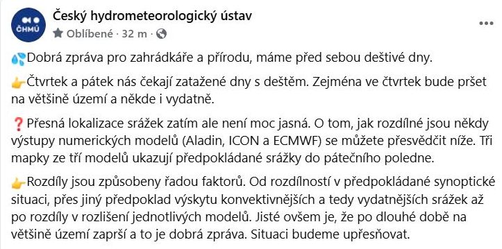 ČESKÝ HYDROMETEOROLOGICKÝ ÚSTAV: Máme před sebou deštivé dny