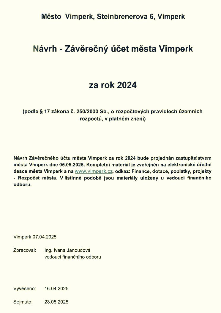 NAŠE MĚSTO VIMPERK: Návrh Závěrečného účtu města Vimperk za rok 2024