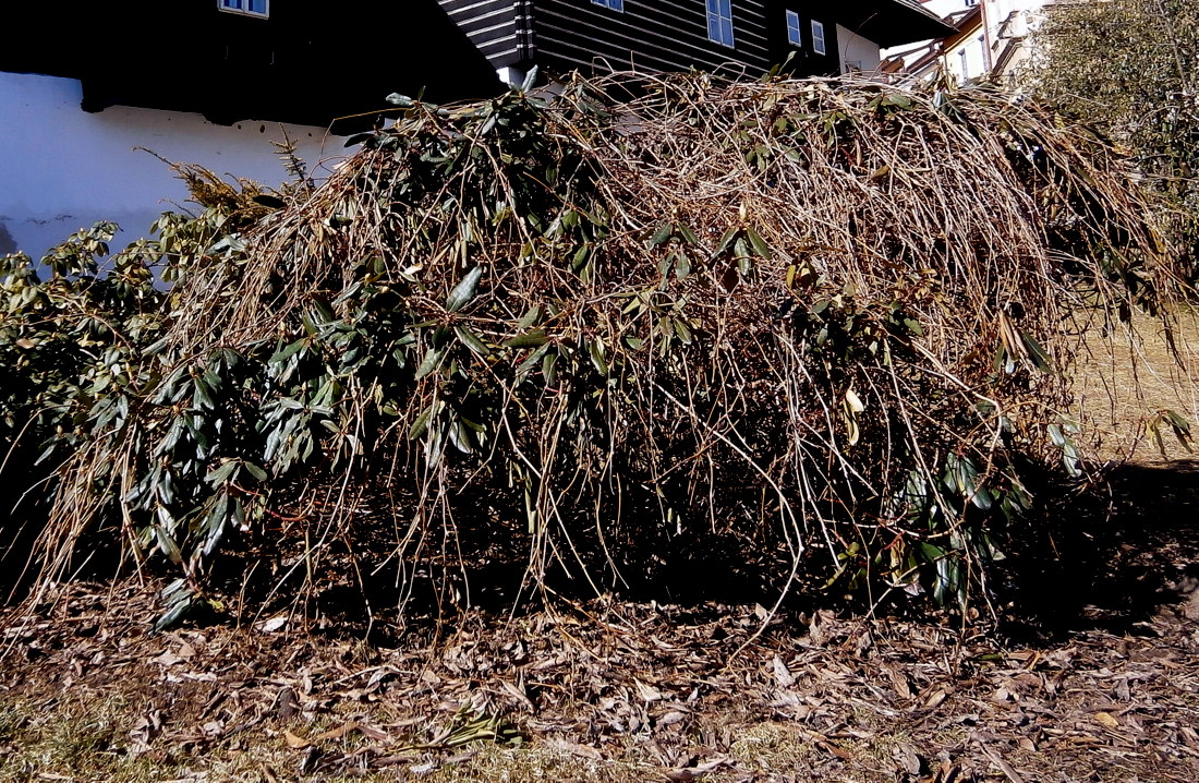 Radnice splnila to, co slíbil mluvčí Milan Brabec. Rododendron na terasách pod srubovými domy byl zbaven nežádoucího plevele, ale s tím zároveň i většiny větví s poupaty před vykvetením. Necháváme prozatím bez redakčního komentáře. Třeba nám mluvčí ještě tento radikální zásah vysvětlí. Zeptáme se.