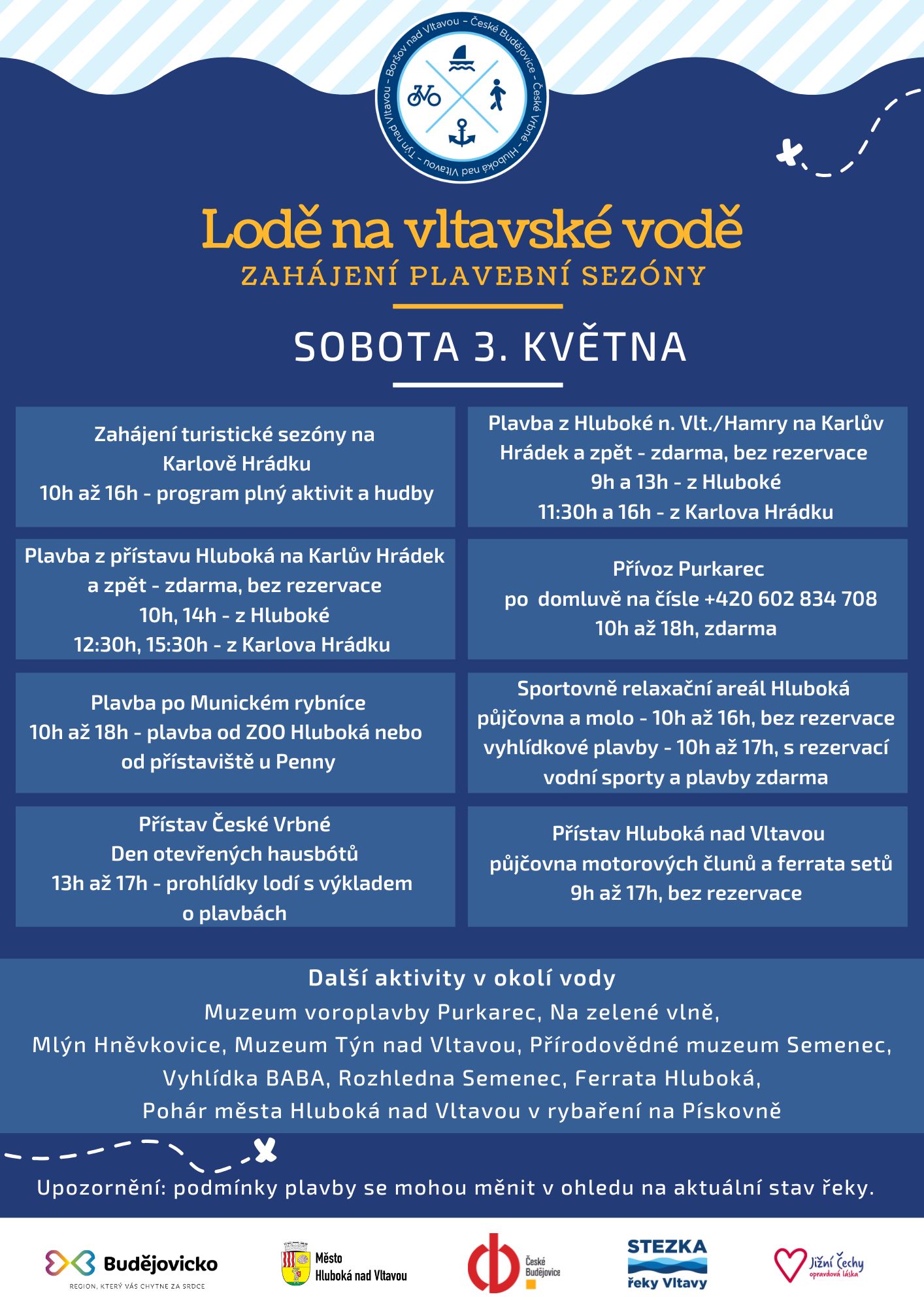 Akce se koná hned na několika stanovištích podél toku Vltavy. Část zázemí bude ve sportovním přístavu v Hluboké nad Vltavou, kde si lidé budou moci půjčit malé motorové čluny bez nutnosti speciálního oprávnění VMP. Zároveň odtud v 10 a 14 hodin vyplouvá loď Lanna Jr. na vyhlídkovou plavbu na Karlův Hrádek. Druhá loď na Hrádek vyplouvá z přístaviště Hluboká – Hamry pod mostem do Zámostí v 9 a ve 13 hodin. Obě linky svezou turisty také zpět na Hlubokou. Přes Munický rybník do Zoo Hluboká vyplouvá loď zdarma dle pravidelného jízdního řádu každou hodinu. Nástupní místo je v parku na břehu rybníka u kruhového objezdu nebo u ZOO Hluboká. Ve Sportovně relaxačním areálu Hluboká bude od 10 do 16 hodin otevřena půjčovna nejrůznějších drobných plavidel, jako jsou mořské kajaky, šlapací i klasické paddleboardy, malé čluny nebo ferratové vybavení.
