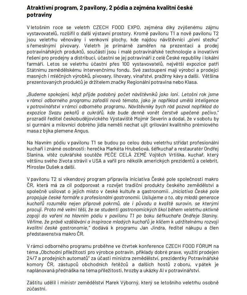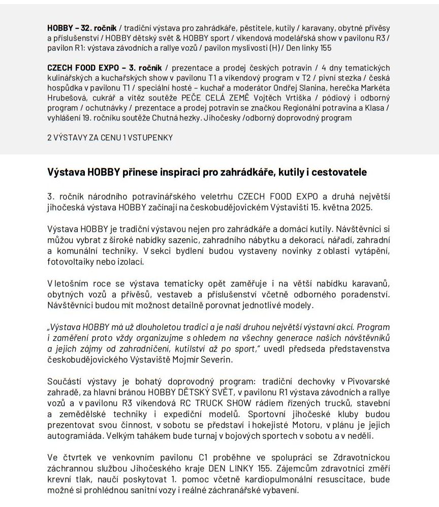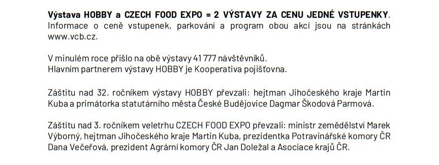 JIŽNÍ ČECHY: 32. ročník výstavy HOBBY a 3. ročník národního potravinářského veletrhu CZECH FOOD EXPO (15. – 18. května)