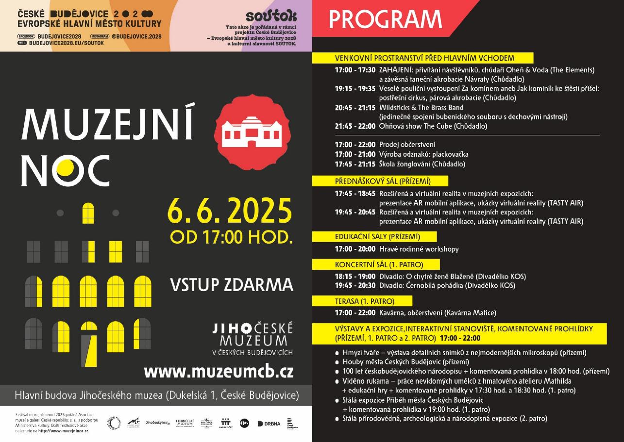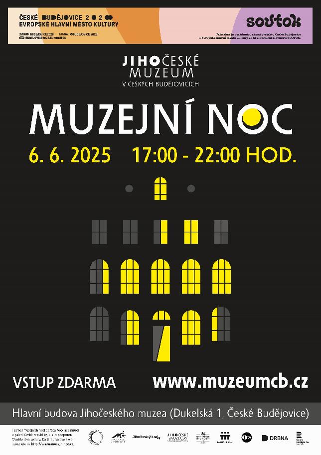 Srdečně vás zveme na tradiční akci konanou v rámci celorepublikového Festivalu muzejních nocí, který pořádá Asociace muzeí a galerií ČR, z.s., s podporou Ministerstva kultury. Těšit se můžete na bohatý program pro děti i dospělé a vstup je ZDARMA! Muzejní noc se koná v historické budově Jihočeského muzea v Českých Budějovicích (Dukelská 1) v pátek 6. června 2025 od 17:00 do 22:00 hodin. Akce je pořádána rovněž u příležitosti 760. výročí založení města České Budějovice a v rámci projektu České Budějovice – Evropské hlavní město kultury 2028 a městské kulturní slavnosti SOUTOK.