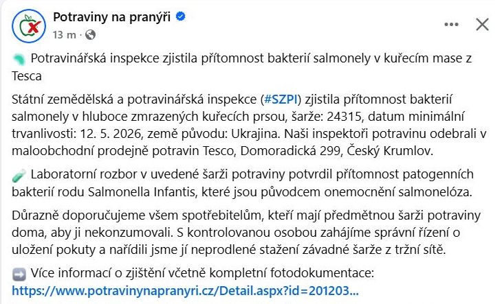 AKTUÁLNĚ: Potravinářská inspekce zjistila přítomnost bakterií salmonely v kuřecím mase z Tesca