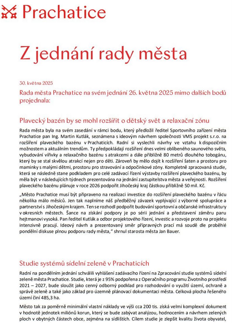 JIŽNÍ ČECHY: Co se děje v Prachaticích. Informace ze schůze městských radních – 14. května 2025