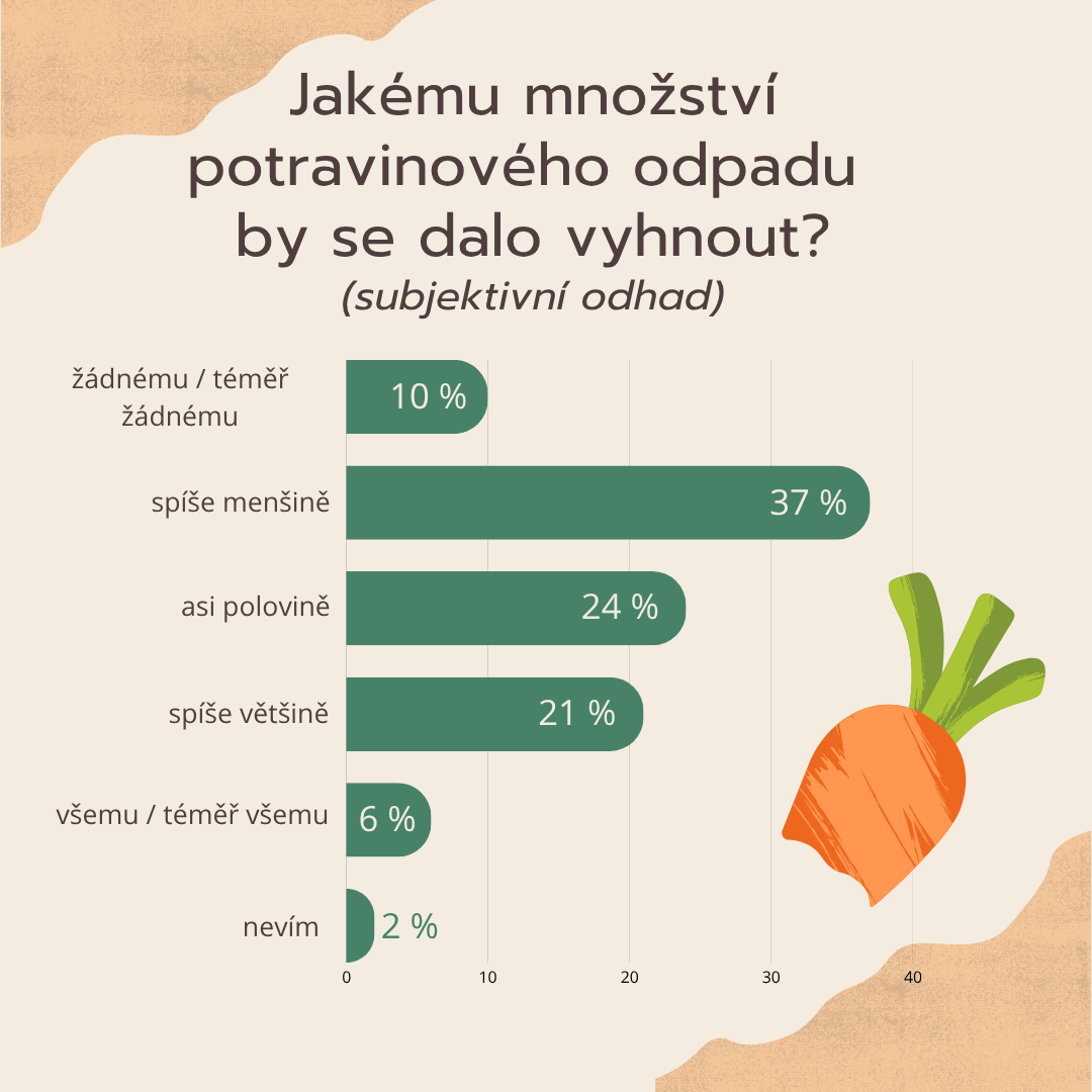 Téměř dvě třetiny (65 %) občanů deklarují, že celkové množství potravin vyhozených jejich domácností nepřesahuje 10 %. Pětina (20 %) dotázaných se pak přiklání k variantě, že jejich domácnost vyhodí více než 10 %, ale méně než čtvrtinu potravin. Pouze 3 % dotázaných přiznala vyhazování více než čtvrtiny, ale méně než poloviny potravin. Naopak 12 % veřejnosti tvrdí, že jejich domácnost nevyhazuje žádné potraviny.