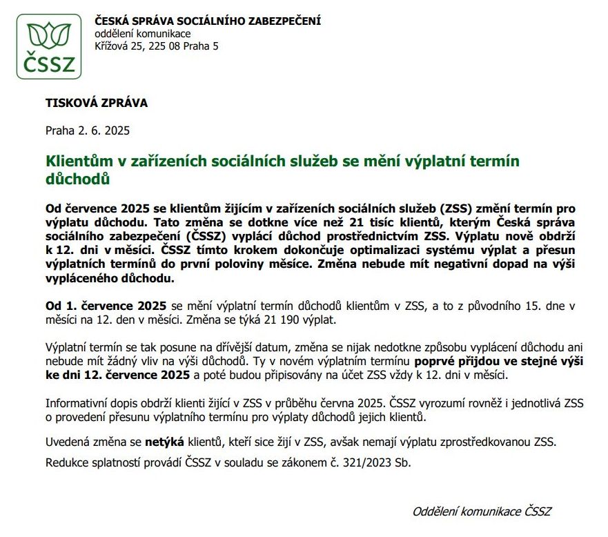 AKTUALITY: Klientům v zařízeních sociálních služeb se mění výplatní termín důchodů