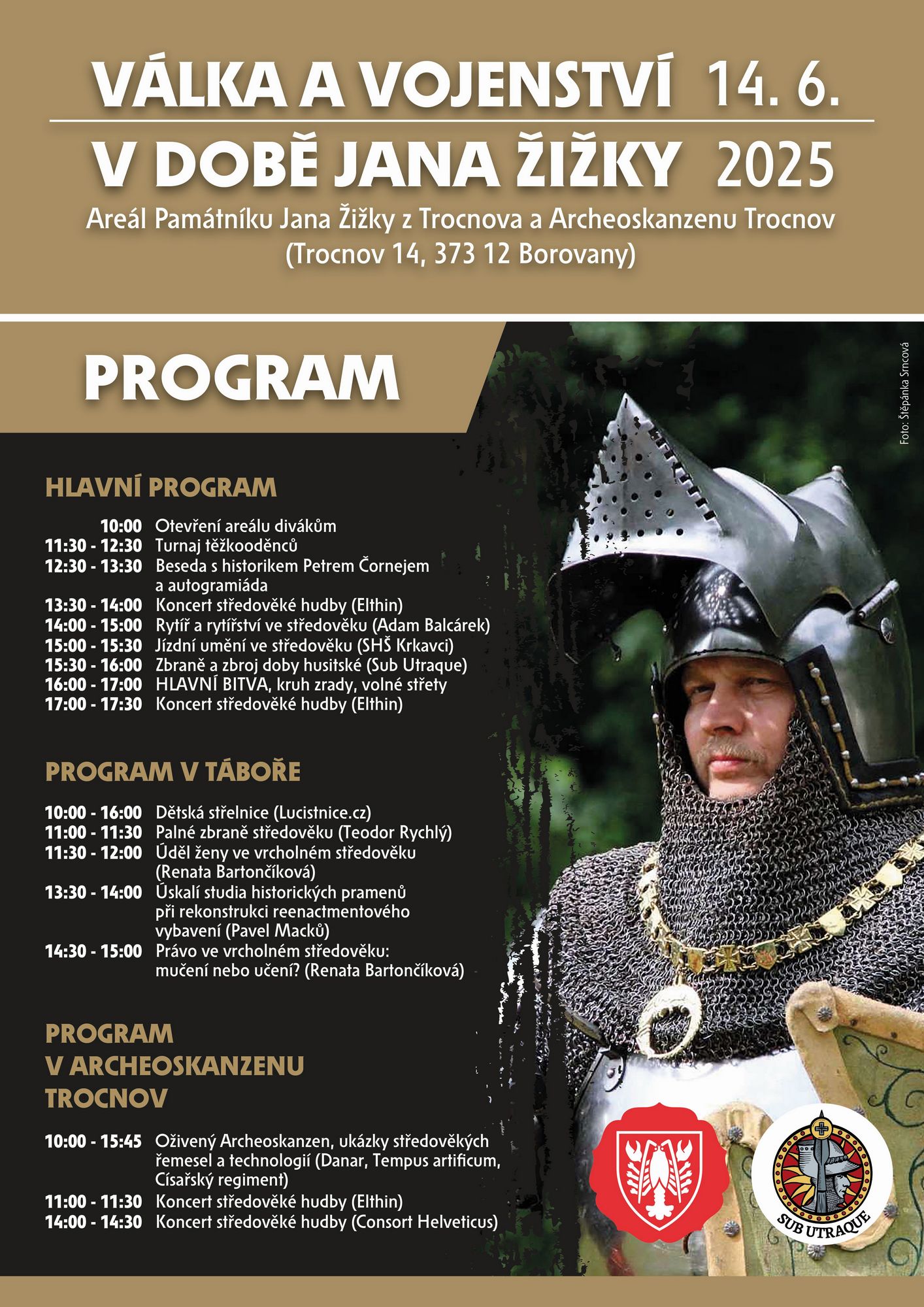 Areál se pro širokou veřejnost otevře v 10:00 hod. dopoledne. Program nabídne třeba turnaj těžkooděnců, besedu a autogramiádu s historikem Petrem Čornejem, koncerty středověké hudby v podání kapely Elthin nebo dětskou střelnici uskupení Lucistnice.cz. Největším lákadlem akce je hlavní bitva, zaujme také kruh zrady nebo volné střety středověkých bojovníků. Nebudou chybět ani reenactoři na koních, zbraně a zbroj doby husitské představí sdružení Sub Utraque.