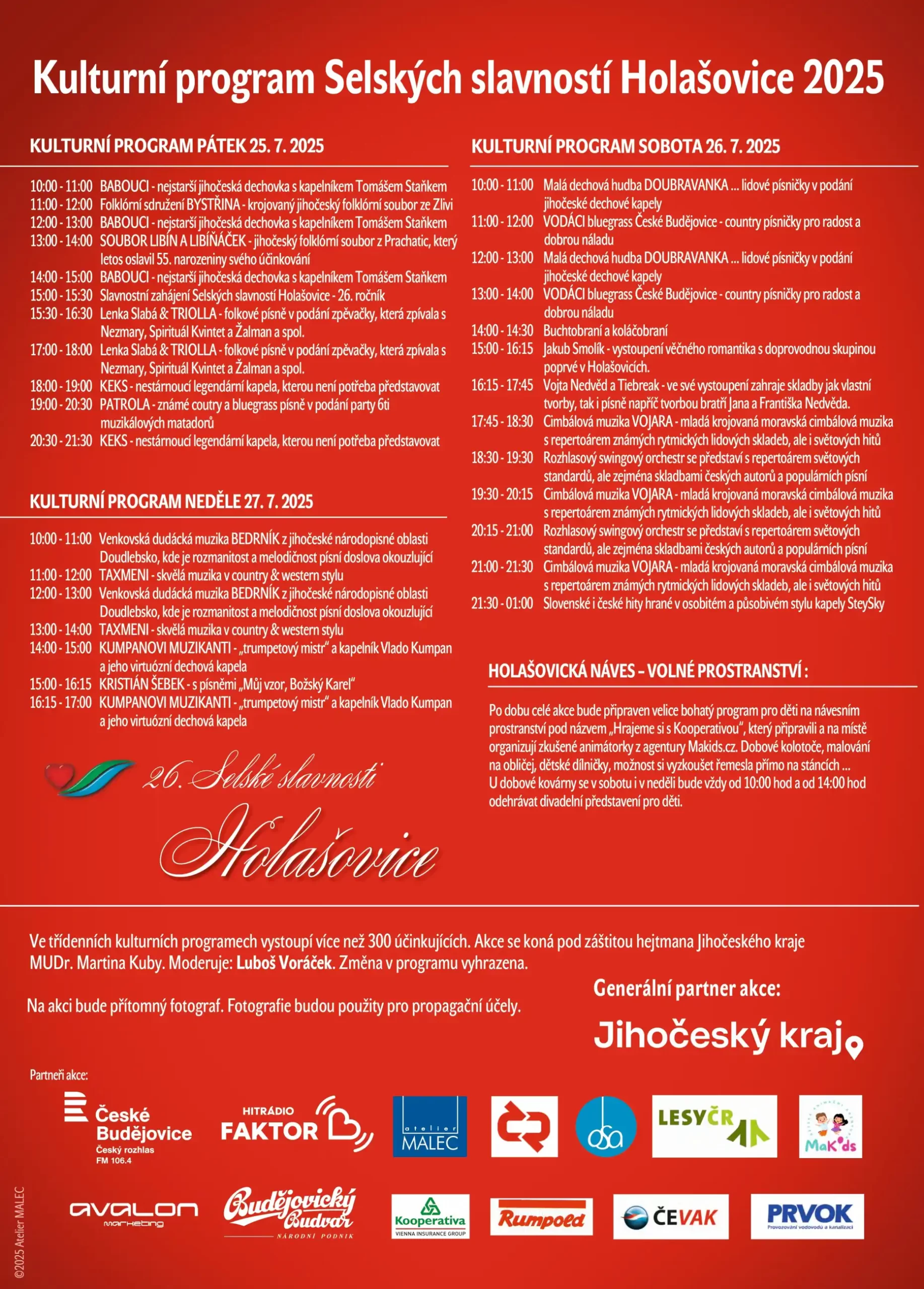 Organizátoři letos slibují opravdu bohatý a velkolepě pojatý program. Na holašovické návsi se návštěvníci mohou těšit na účinkující v žánru folkloru, cimbálu, dechovky a folku, ale také rocku a rock’n’rollu. Mezi hlavní interprety patří skupiny Babouci, KEKS nebo zpěváci Jakub Smolík a Vojta Nedvěd. V neděli odpoledne pak vystoupí Kristián Šebek s písněmi “Můj vzor, Božský Karel”. V rámci animačních programů pod vedením agentury Makids si děti vyzkouší nejen tradiční řemesla v tvořivých dílnách či přímo na stáncích, ale čeká je například také výuka mazurky nebo loutkové divadlo. Pro snadnou dostupnost bude jako obvykle jezdit kyvadlová doprava z Českých Budějovic do Holašovic a zpět. Detailní informace o programu a aktivitách jsou dostupné na www.holasovice.eu.