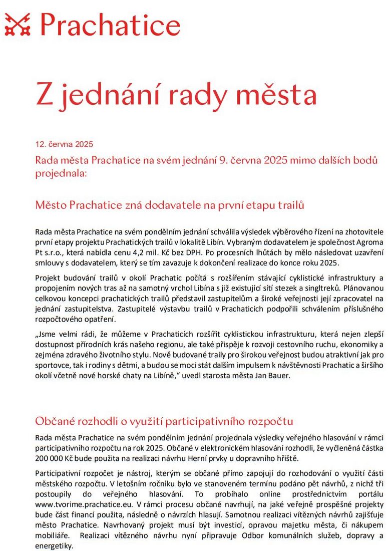 JIŽNÍ ČECHY: Co se děje v Prachaticích. Informace ze schůze městských radních – 26. května 2025