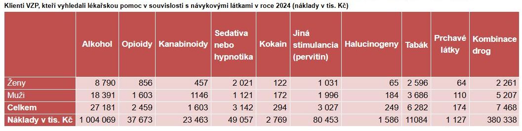 V roce 2024 vydala Všeobecná zdravotní pojišťovna na léčbu závislostí rekordních 1,59 miliardy korun. Největší část této sumy připadla na poruchy způsobené alkoholem, který i nadále dominuje mezi návykovými látkami. Výrazně však roste i počet pacientů závislých na lécích, zejména na sedativech a hypnotikách. Náklady na jejich léčbu se za posledních 10 let více než zdvojnásobily.
