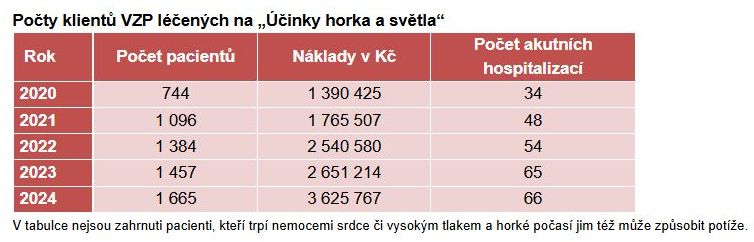 Úpal, úžeh, mdloby z horka, vyčerpání z horka způsobené ztrátou minerálů, vyčerpání z horka způsobené nedostatkem tekutin, mdloby nebo otoky z horka – to jsou jen některé ze zdravotních stavů způsobených vystavením vysokým teplotám a slunečnímu záření. Loni kvůli tomu zamířilo k lékaři 1665 klientů VZP ČR a náklady na léčbu diagnózy nazvané „Účinky horka a světla“ se v roce 2024 přehouply přes 3,6 milionu korun. Léčba zahrnuje například rehydrataci a ochlazování a v závažných případech i hospitalizaci, která vloni byla nutná u 66 klientů VZP ČR.