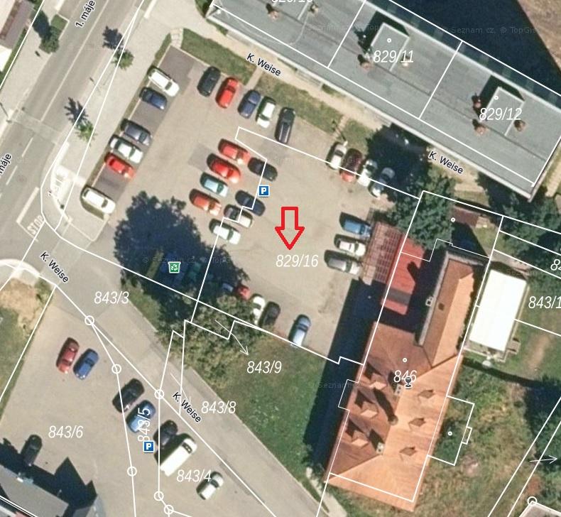 • Za jakých podmínek využívá město Vimperk ve čtvrti Karla Weise polovinu parkoviště na pozemku 829/16 (parkování veřejnosti, kontejnery na odpad), která je v soukromém vlastnictví (viz obrázek). Platí nájem? Pokud ne, mohlo by vstřícně přerostlou trávu nechat na vlastní náklady posekat?