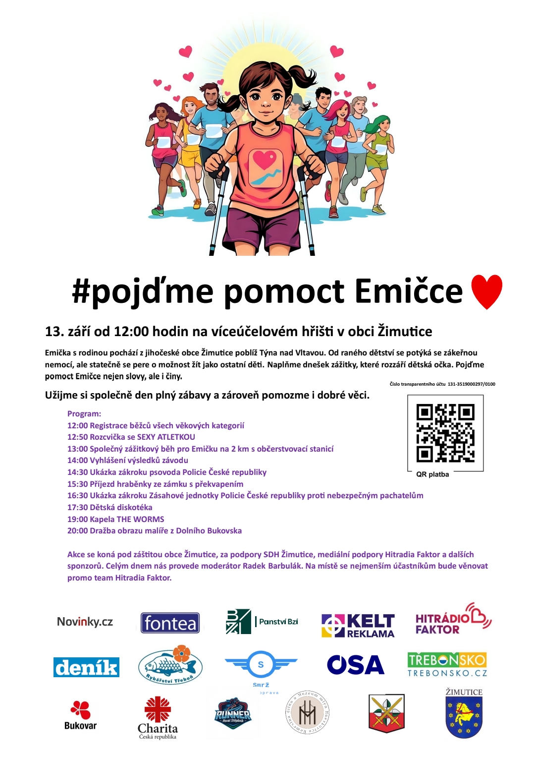 Ondřejovi se pomohlo pro nemocného Martina i díky uspořádané charitativní akci v loňském roce vybrat více než 500 000 korun a věří, že by stejný úspěch mohlo mít i charitativní odpoledne, které se uskuteční s cílem pomoci Emičce Floriánové. Den pro Emičku s názvem #pojdme pomoct Emičce se koná v sobotu 13. září od 12:00 hodin na víceúčelovém hřišti v obci Žimutice, pod záštitou obce Žimutice. Bude zde opět velmi zajímavý a bohatý program. Poběží se zážitkový běh pro děti i dospělé a návštěvníci se mohou těšit na akční ukázku policejních psovodů a jihočeské policejní zásahové jednotky, také tito profesionálové chtějí podpořit rodinu Emičky. Kromě jiného nebude chybět ani dětská diskotétka, hudební vystoupení nebo dražba obrazu.