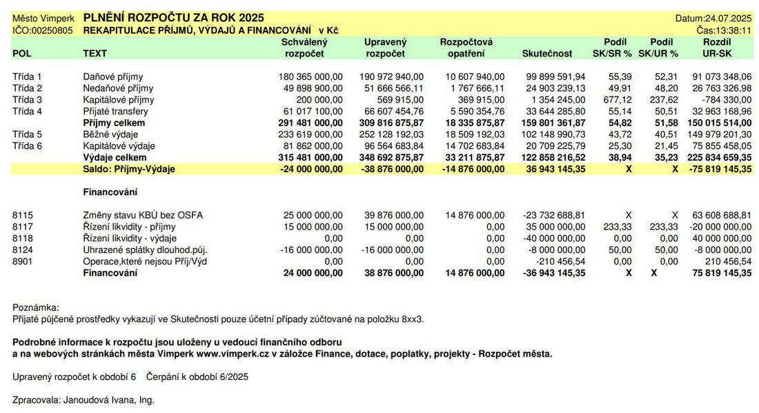 NAŠE MĚSTO VIMPERK: Radnice informuje o plnění rozpočtu k 30. 6. 2025