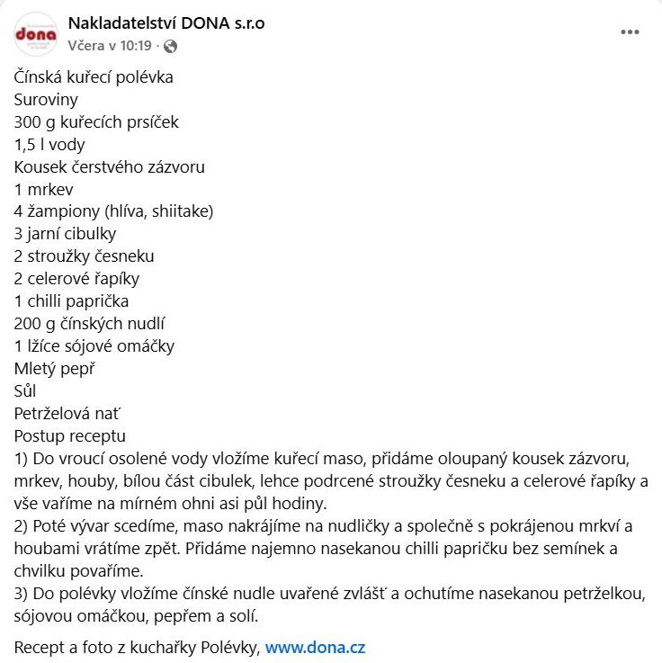 RECEPTY Z KUCHYNĚ: Čínská kuřecí polévka