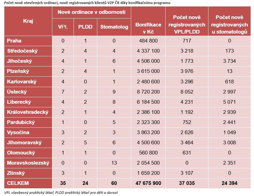 Už třetím rokem funguje motivační program Všeobecné zdravotní pojišťovny pro ambulantní poskytovatele pod názvem VZP PLUS. Program obsahuje širokou škálu bonifikací, včetně bonifikace pro poskytovatele a přímé finanční pobídky k otevření ordinace v tzv. preferovaných oblastech. V místech, kde je zhoršená dostupnost zdravotních služeb, nabízí VZP všeobecným praktickým lékařům, praktickým lékařům pro děti a dorost a stomatologům k otevření nové ordinace finanční bonus ve výši několika set tisíc korun. Díky tomu vzniklo za posledních 30 měsíců (od zahájení programu) 35 ordinací praktického lékaře pro dospělé, 24 pro děti a 60 stomatologických.