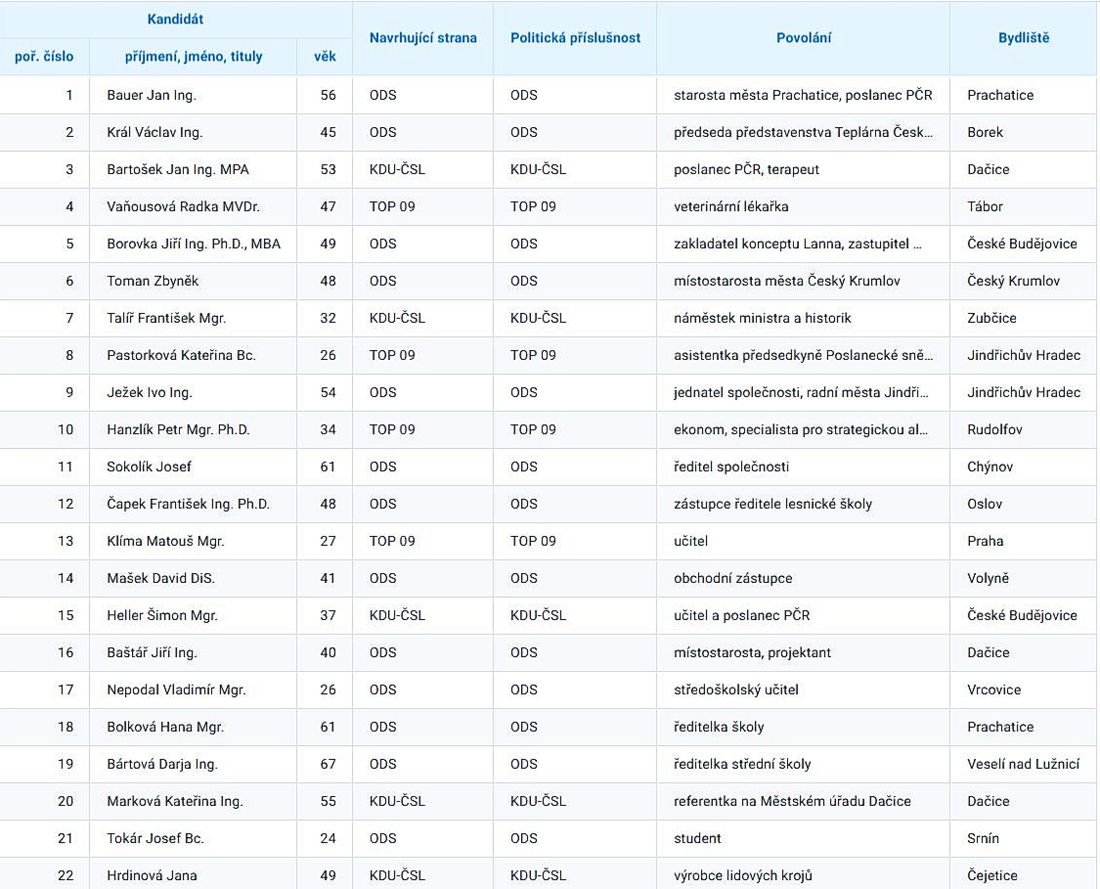 VOLBY 2025: Kandidátní listiny pro Jihočeský kraj – č. 11 SPOLU (ODS, KDU-ČSL, TOP 09)