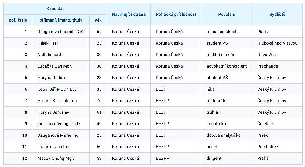 VOLBY 2025: Kandidátní listiny pro Jihočeský kraj – č. 17 Koruna Česká (monarch. str. Čech, Moravy a Slezska)