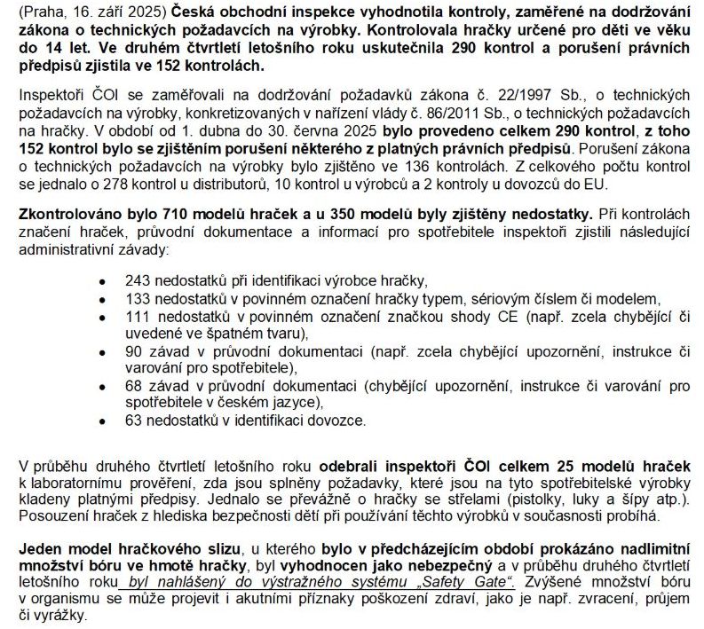 AKTUALITY: Kontroly hraček ve druhém čtvrtletí potvrdily opakující se nedostatky v povinném značení výrobků, porušení právních předpisů bylo zjištěno ve více než polovině z provedených kontrol